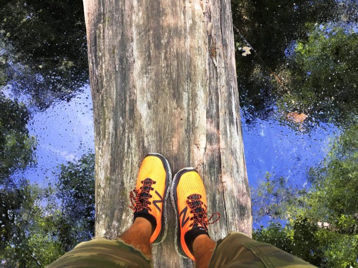 The bridge is in some state of decomposition along its entire length, due to the intensity of light and heat, and constantly being wet. I try to run off center, closer to the struts where the cross ties are nailed, to limit my impact, and also, ostensibly, to keep from putting my foot through a rotten board, and my face into the splintery mess in front of me. In my mind, I can even hear the sound the boards make as I stride along.