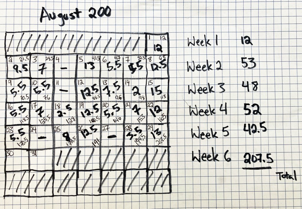 In August, M, my primary running partner, and I set out to run 200 miles. You can read about is here, here, and here. Most of the people I discussed the project with before and during locked immediately onto what the daily mileage would need to be, but I didn’t think a lot about that. I knew there would be long days and short days. Instead, I aimed for 50 miles per week, knowing the 31 day month would give me 3 extra days to work with. That seemed like a safe strategy.