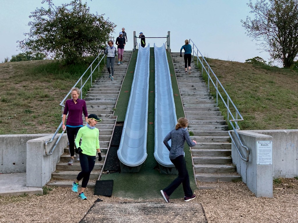 We are lucky to have the perfect set of stairs in our park, so I use them a lot for cardio breaks. If you can’t find stairs to work on, find a hill. If you don’t have a hill, substitute burpees. I’d say 3 burpees is equivalent to one trip up the stairs.