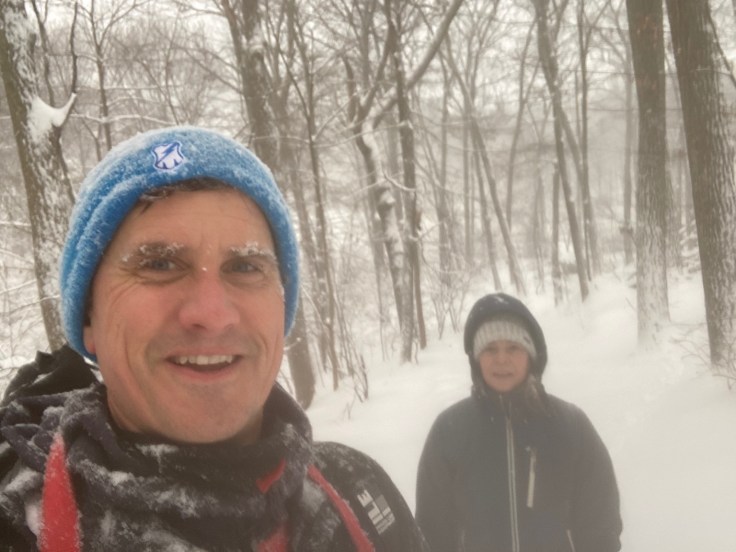 Caitlin was on a schedule. The challenge told her she needed to complete this 5k faster than the same route and distance on Monday, the difference being that it was 45F and dry on Monday. She let us know right away she didn’t expect to beat that time, but we pushed on as best we could, kicking our boots into the depressions from Meghna and Caitlin’s show shoes. I was sweating, and my calves were beginning to cramp from the effort of pushing all that snow.