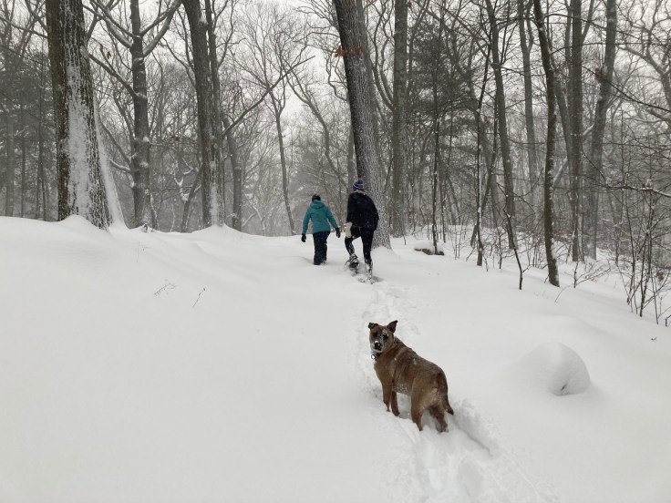 So we geared up and set off, and if it wasn’t for the wind-driven snow stinging the side of my face as we crossed the park to meet Caitlin and Meghna too, then I would have second-guessed leaving those snow shoes at home. Django looked to be swimming in the deep powder, his tail sawing back and forth, ice building up on his nose. Dogs are funny in the snow.