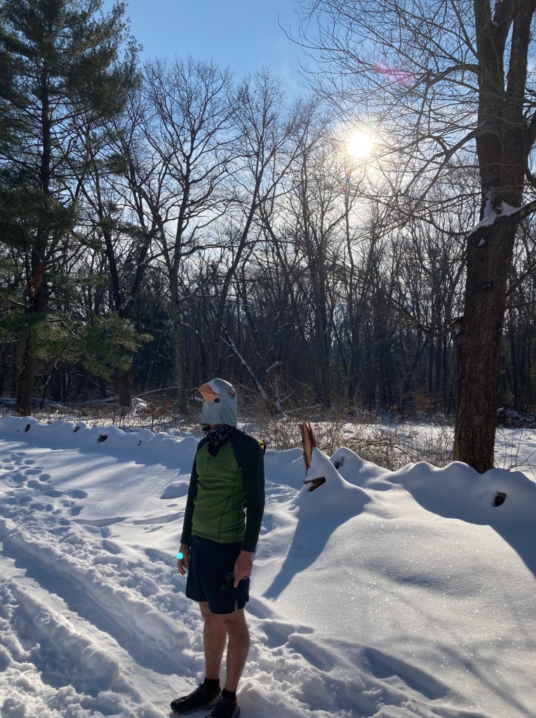 So Meghna and I ran this morning, the trails tamped down firm and a little crunchy on top. Not too bad. She wore spikes. I didn’t. We both did fine. I made her stop somewhere in the middle to take photos of me wearing a pigeon mask, because who cares how fast or how far we went?