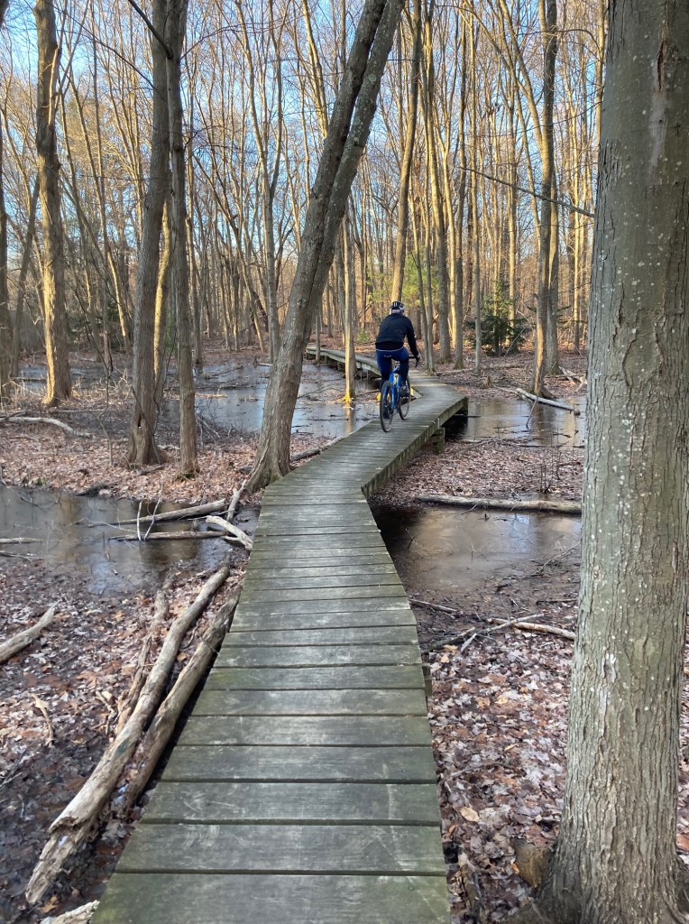 C continued to ask me how I was doing, and honestly, the roots were taking it out of me. My right shoulder, the one I wrecked last Spring, was cramping up. I kept pedaling, because that’s what you do, but I also secretly wished that, instead of turning right into another patch of woods, we would turn left, toward home.