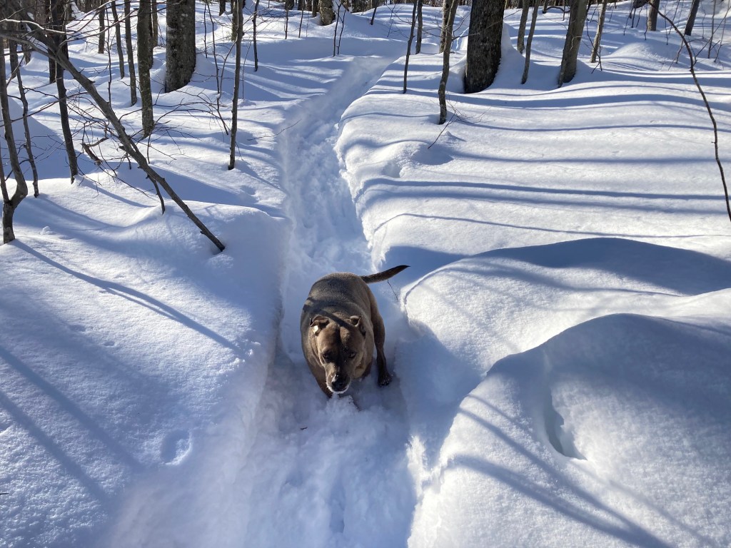 The next morning was clear and cold again. I let Django out to pee in the backyard, and he minced and darted around in the snow as usual. When I offered him the chance to go back out into the woods, where fresh snow promised him the need to wade through, chest-deep, his tail wagged and he pressed his nose into my leg.