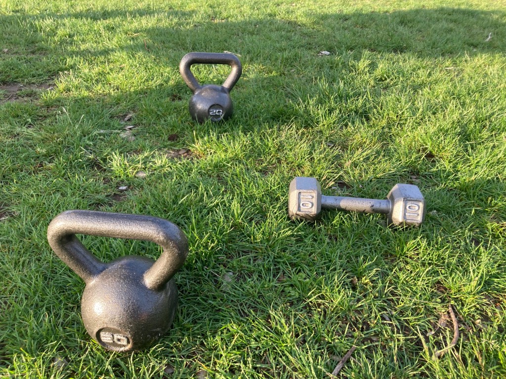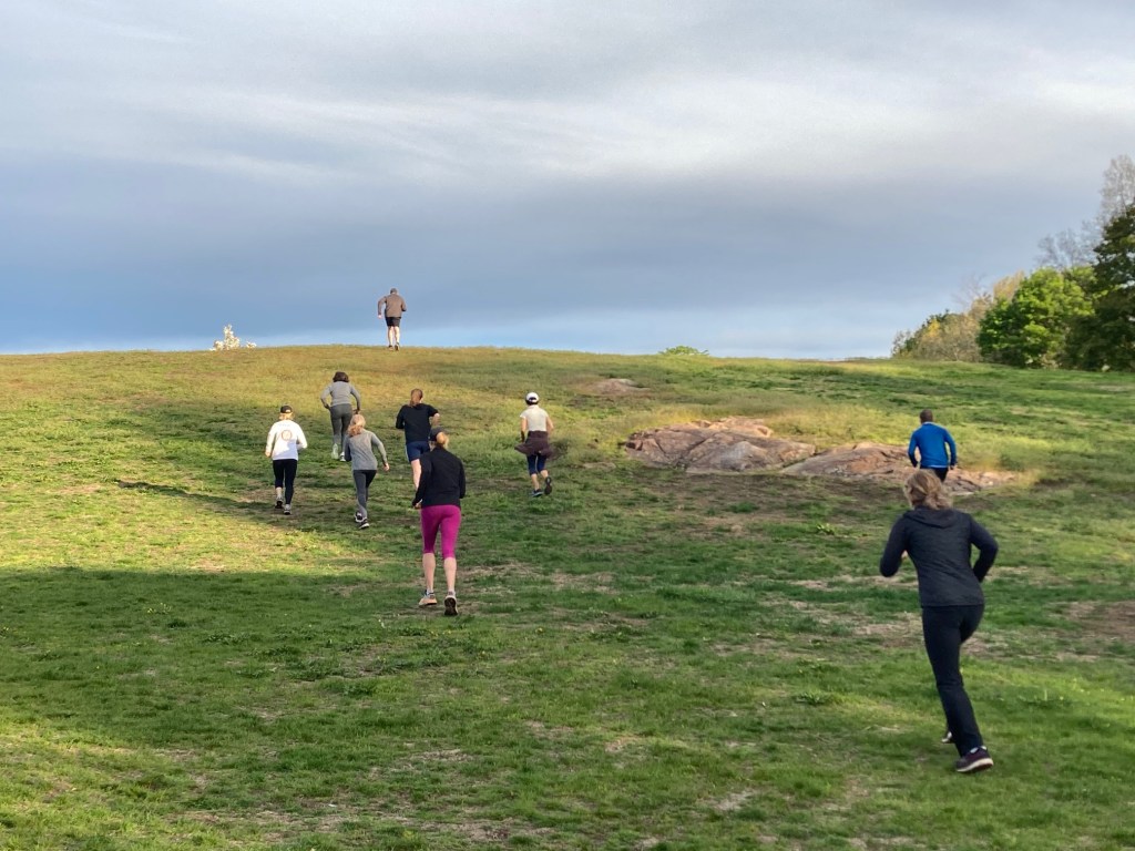 This morning’s funfest consisted of three locations and three sets of six exercises. Each person would roll a die and do the exercise that corresponded to that number at the three locations. We started in the playground, where we used the swings for a few of the sets. Location 2 was at the bottom of a long, steep hill. Location 3 was at the top of that hill.