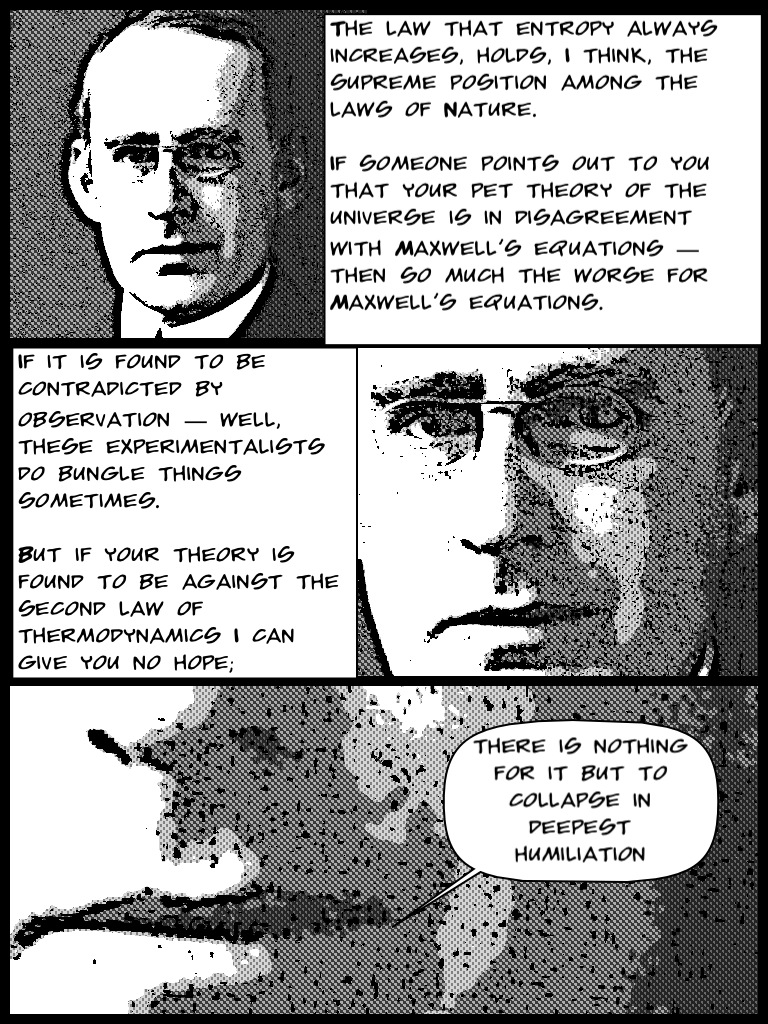 Entropy is actually what gives time direction. The mere fact of dilapidation orients us in space-time. Old things do not become new again, not really. Order is not created, at least not in a sustained way. If heat could be created from not heat (i.e. not energy), we could live backwards, but it can’t and we can’t. The universe grows cold. Death comes to us all.